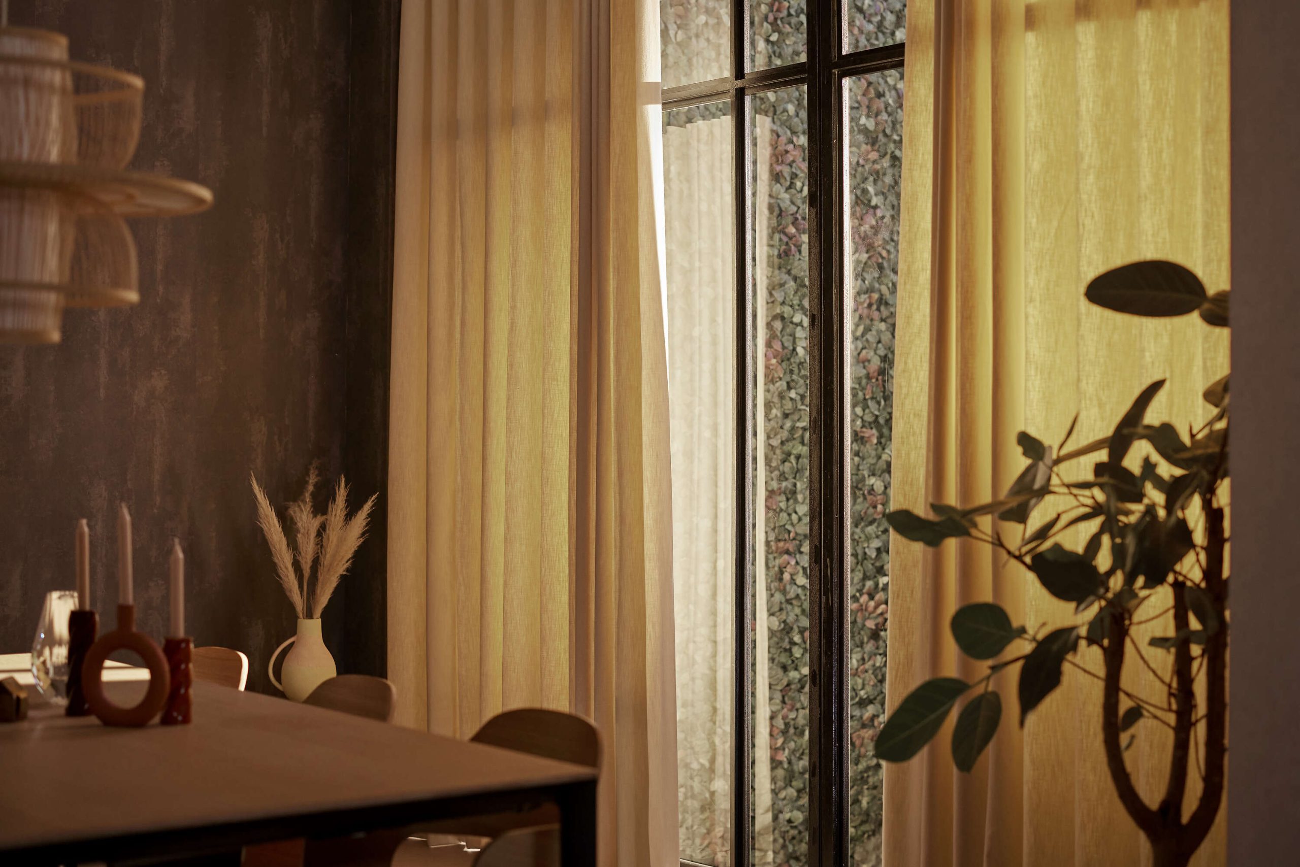 Smart TIP: Zasłony z napędami Somfy mogą same odsłaniać się o poranku i zamykać wieczorem, wspierając naturalny rytm dnia. Inteligentne oświetlenie pozwala jednym kliknięciem zmienić atmosferę – od jasnego światła sprzyjającego koncentracji po miękki półmrok wieczoru.